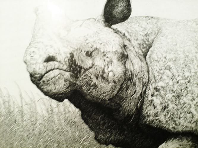 Sorry for the horrible mobile phone pics. I don't have access to a scanner while my younger sisters are home for school holidays. But those are just an example of some of the pictures in the book. The one with the horseman was an example of creative freehand work, and the rhino's textured skin is made out of crawling people - it reminded me of Heironymous Bosch.